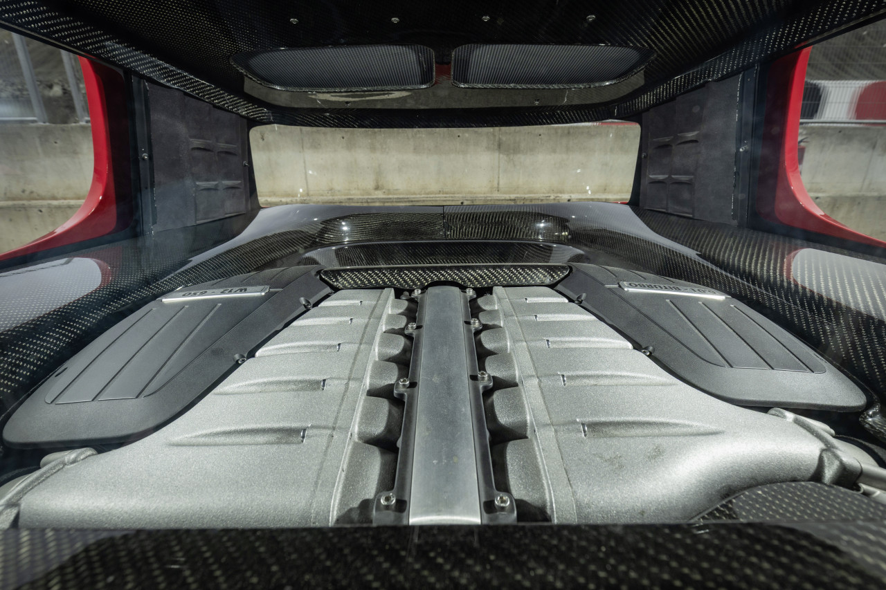 Zážitok začínal nastupovaním cez rozšírené prahy, ľahké dvere som od nervozity zatváral na dvakrát. Auto už bolo z predchádzajúcej jazdy naštartované a obrovské ventilátory sa snažili chladiť obrovský dvanásť valec s výkonom 478 kW (650 koní) a silou 750 Nm umiestnený za prednými sedadlami. Ak by Vás to zaujímalo, štartovacia procedúra vyžaduje zapojenie prívodu paliva z nádrže umiestnenej vpredu a ... otočenie klasickým kľúčom Golfu piatej generácie v spínacej skrinke. Jednoduché.