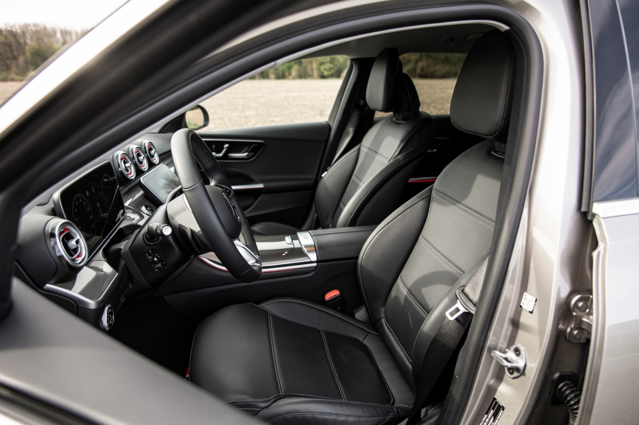 Architektúra interiéru zodpovedá novej triede C a vychádza z línie výbavy AVANTGARDE, rovnako je k dispozícii infotainment MBUX druhej generácie. Digitálny prístrojový panel má uhlopriečku 12,3 palca, vertikálne orientovaná obrazovka multimediálneho systému má v základe displej s uhlopriečkou 10,25 palca alebo ako súčasť niektorého balíka príplatkovej výbavy s uhlopriečkou 12,3 palca ako tomu bolo aj v našom prípade. Zobrazovacie rozhrania dopĺňa vynikajúci head-up displej, ktorý pre vodiča premieta zobrazovacie pole s rozmerom približne 23 x 8 centimetrov.